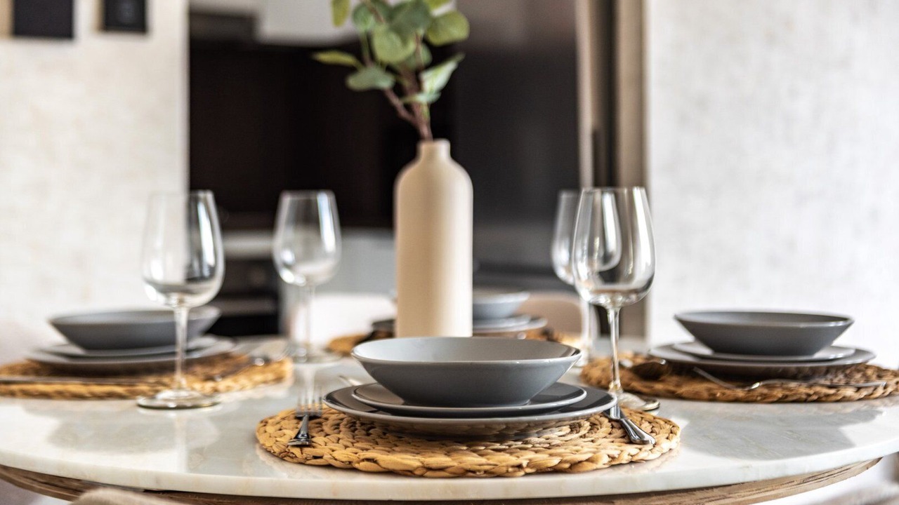 The living room has a sitting area, a TV to watch all your favorite shows, and a dining table. It is also generously lit, perfect for sharing moments with your group.